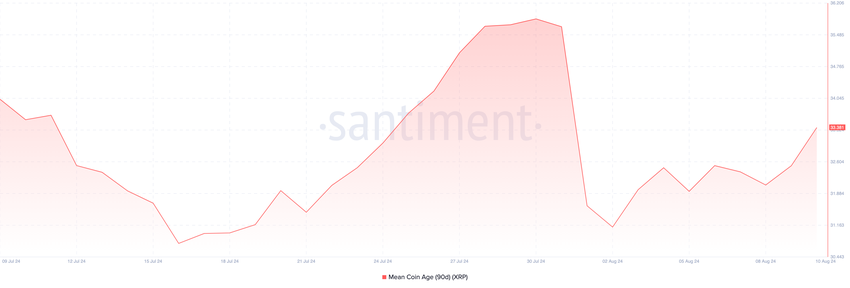 I tillegg viser on-chain data fra Santiment at gjennomsnittsalderen på mynter (MCA) har økt. Enkelt forklart er MCA gjennomsnittet av alle tokens på en blokkjede. Når lesningen øker, betyr det at tokens som har vært inaktive en stund, har blitt flyttet.