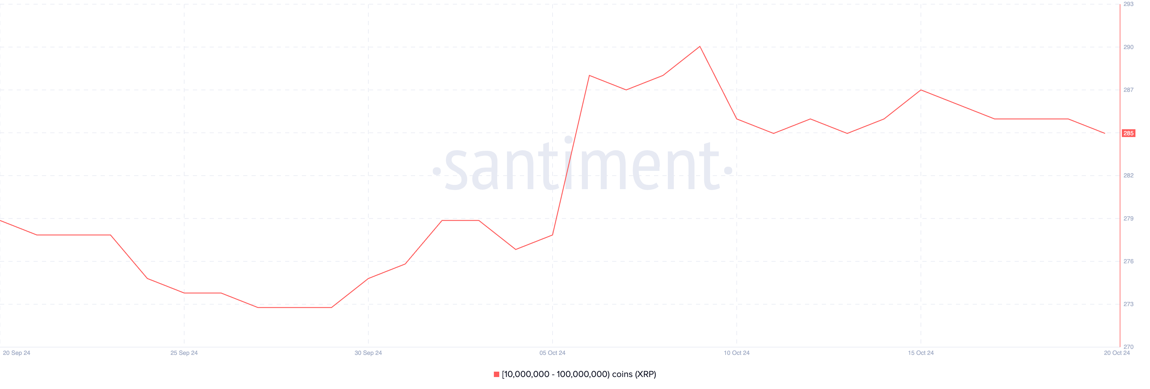 Antallet lommebøker som holder mellom 10 millioner og 100 millioner XRP har vist liten svingning siden 9. oktober. For øyeblikket er det 285 slike lommebøker, og antallet har holdt seg innenfor et smalt område fra 284 til 287 i løpet av den siste uken.