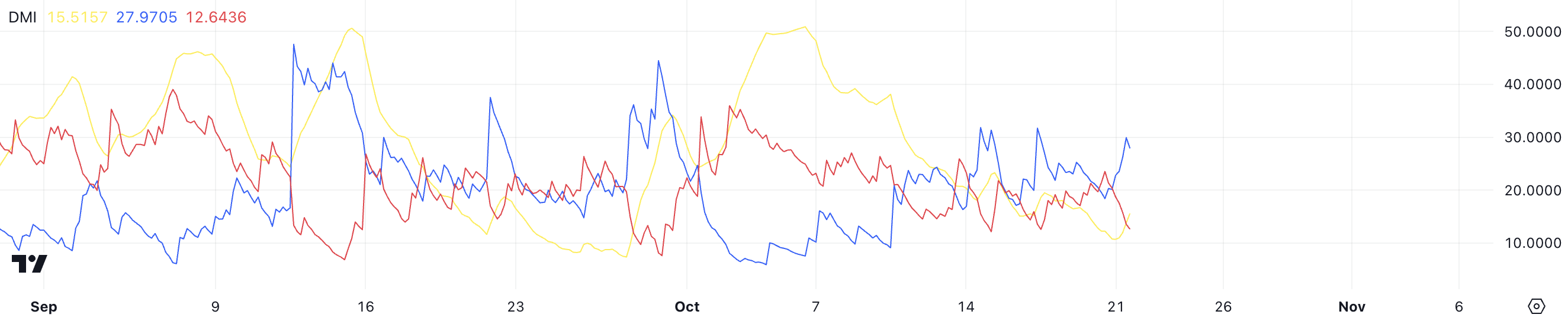 DMI er en teknisk indikator som brukes til å bestemme både retningen og styrken på en trend. Den består av D+- og D–linjene, som indikerer henholdsvis kjøps- og salgspress, sammen med ADX, som måler den generelle styrken på trenden.