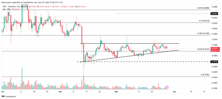 I skrivende stund handles XRP til $ 0,53, over 23,6 % Fibonacci Retracement på $ 0,51. Altcoin beveger seg innenfor den stigende trekanten, og sikter mot en 12% økning hvis den bryter ut. Dette kan sende Ripple native token over 38.2% Fibonacci Retracement-linjen.