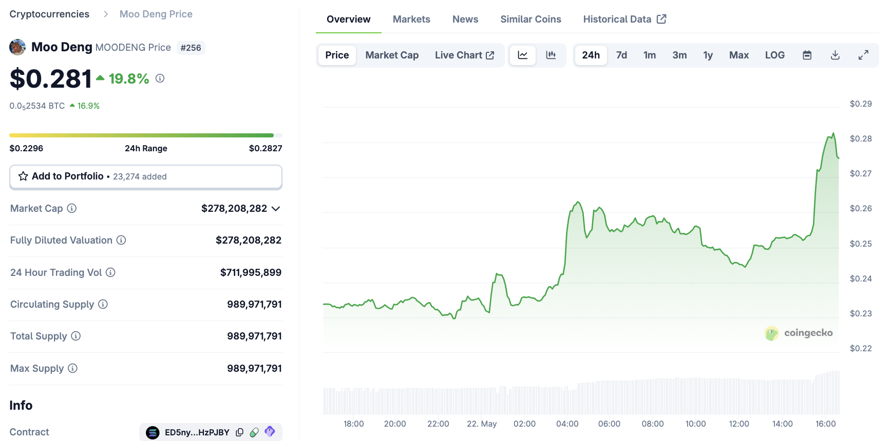 Gjennom mai har meme coinen vist bemerkelsesverdig vekst, selv om den fortsatt er langt fra sin all-time high. Etter dagens listing steg den nesten 19 %, selv om denne veksten raskt avtok.