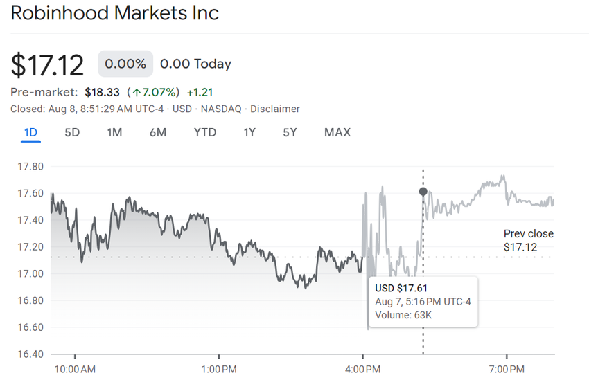 Etter rapporten så Robinhoods aksje, HOOD, en bemerkelsesverdig økning. I handelen etter børstid kl. 17:16 ET, steg den til $ 17,61 fra dagens laveste på $ 16,58. HOODs pris har økt med 38,4 % hittil i år.