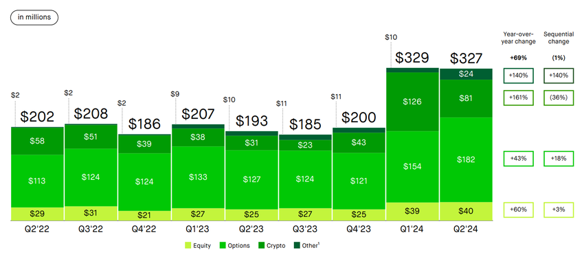 Resultatrapporten fremhevet en økning på 69 % i inntekter basert på transaksjoner til $ 327 millioner, med kryptoinntekter som hoppet med 161 % til $ 81 millioner i denne delen. I tillegg vokste inntekter fra opsjoner og aksjer med henholdsvis 43 % og 60 %. For Q2 2024 steg nettoinntekten til $ 188 millioner, eller $ 0,21 per utvannet aksje, opp fra $ 25 millioner, eller $ 0,03 per utvannet aksje, i Q2 2023.