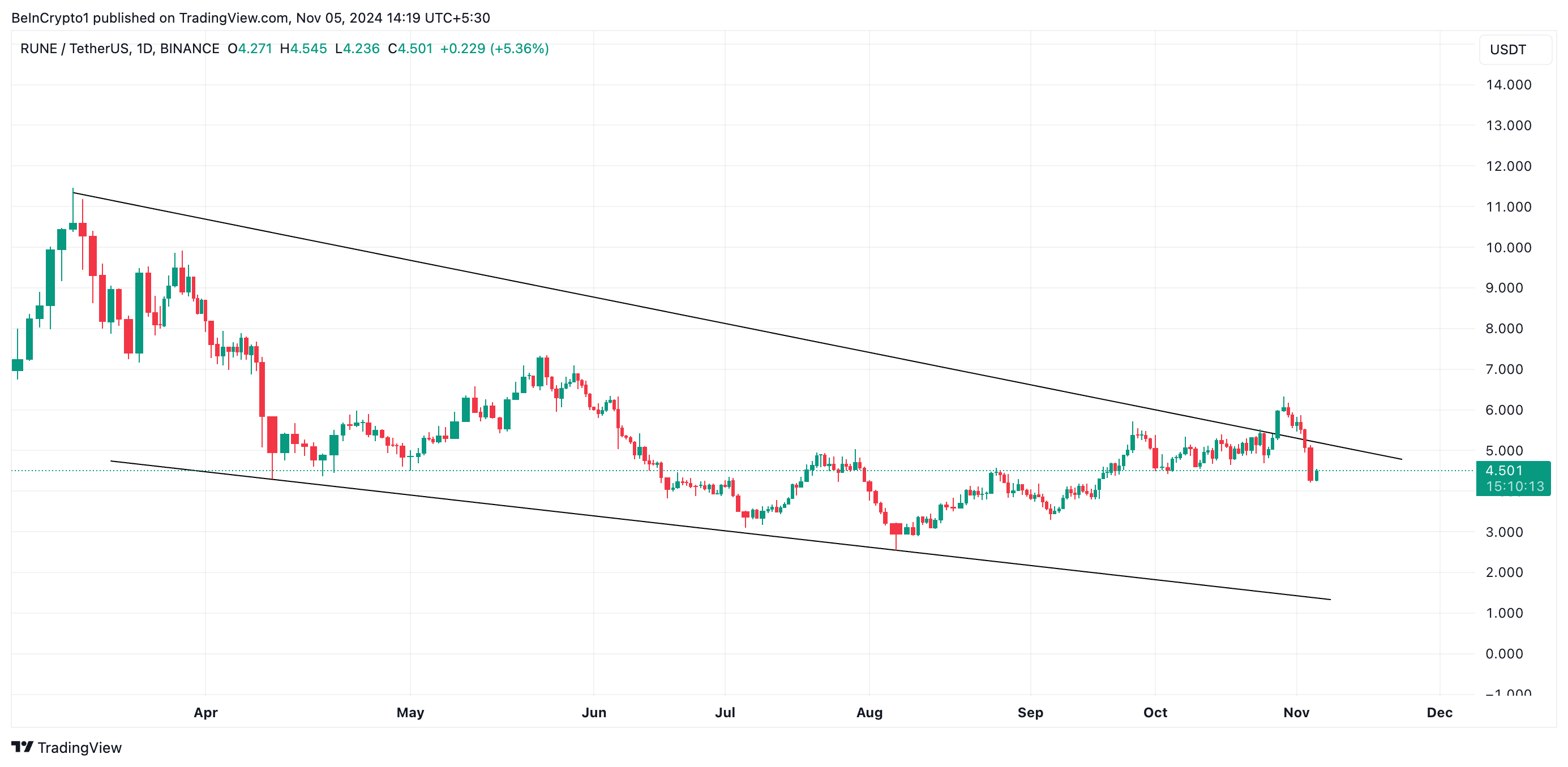 Men RUNE reverserte denne trenden den 30. oktober og har siden falt tilbake innenfor kilen, og skapte en bull-felle. Den raske tilbakefallet til kilen ugyldiggjør utbruddet ettersom myntens pris har gjenopptatt sin tidligere nedadgående trend. Med en handelspris på $ 4,50 i skrivende stund, har RUNEs pris falt med 21 % de siste fire dagene.