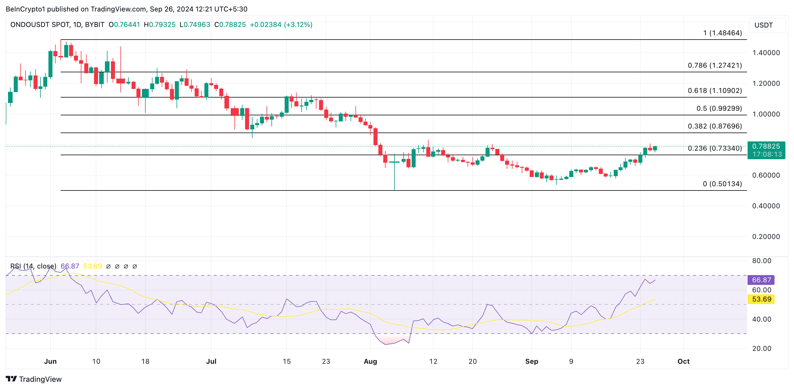 ONDO handles for øyeblikket til $ 0.78, etter å ha opplevd en 24 % prisøkning den siste uken. Den økende etterspørselen etter altcoinen reflekteres i dens stigende Relative Strength Index (RSI), som sporer markedsforhold for å identifisere om et aktiva er overkjøpt eller oversolgt. Ved trykketidspunktet står ONDOs RSI på 66.87, noe som indikerer sterk kjøpsaktivitet og antyder potensialet for en utvidet rally.