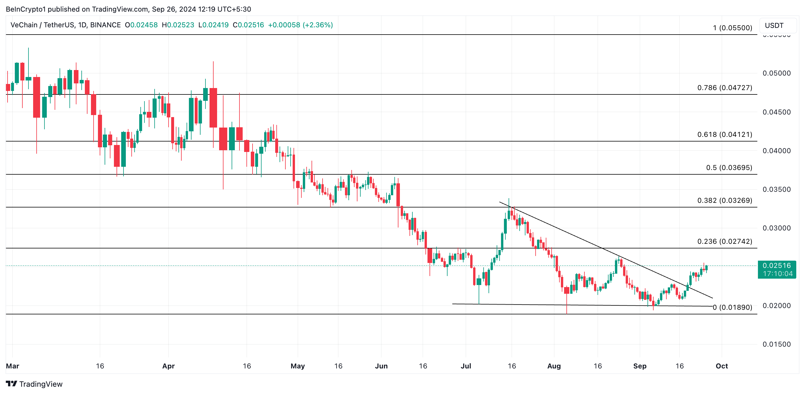 Ifølge dets daglige diagram brøt VET nylig over en synkende trekant, et bullish teknisk mønster, som signaliserer en oppadgående trend. Hvis tokenen lykkes med å reteste bruddlinjen, vil dette bekrefte fortsettelsen av oppgangen, og posisjonere VET til potensielt å nå $ 0.04 i de kommende ukene.