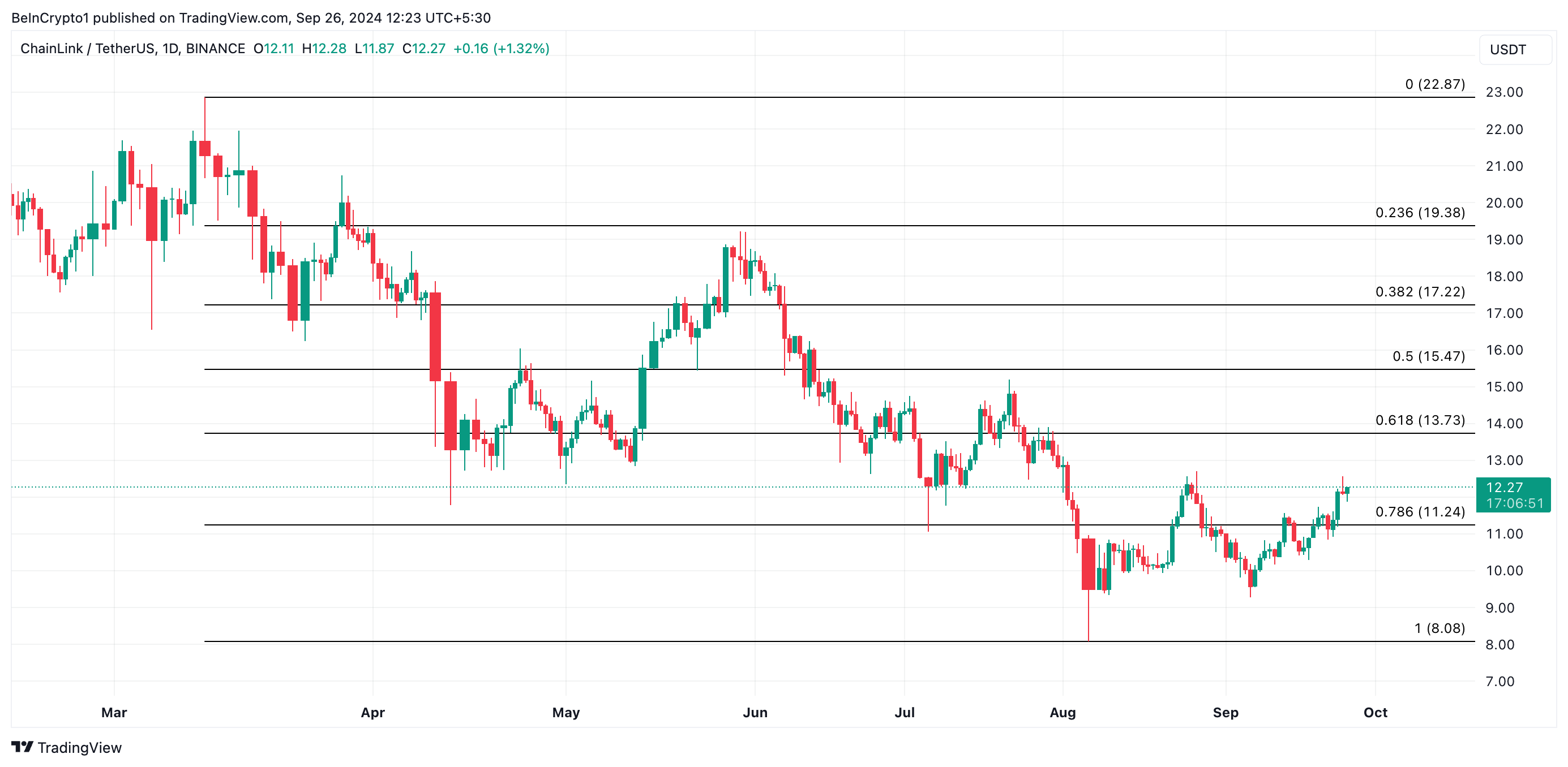 I tillegg har etterspørselen etter altcoinen økt, med en opprettelse av nye adresser for LINK-handel som har spikret med 29 % i løpet av samme periode. Hvis denne etterspørselen forblir sterk, kan LINK utvide sine gevinster til $15,47.