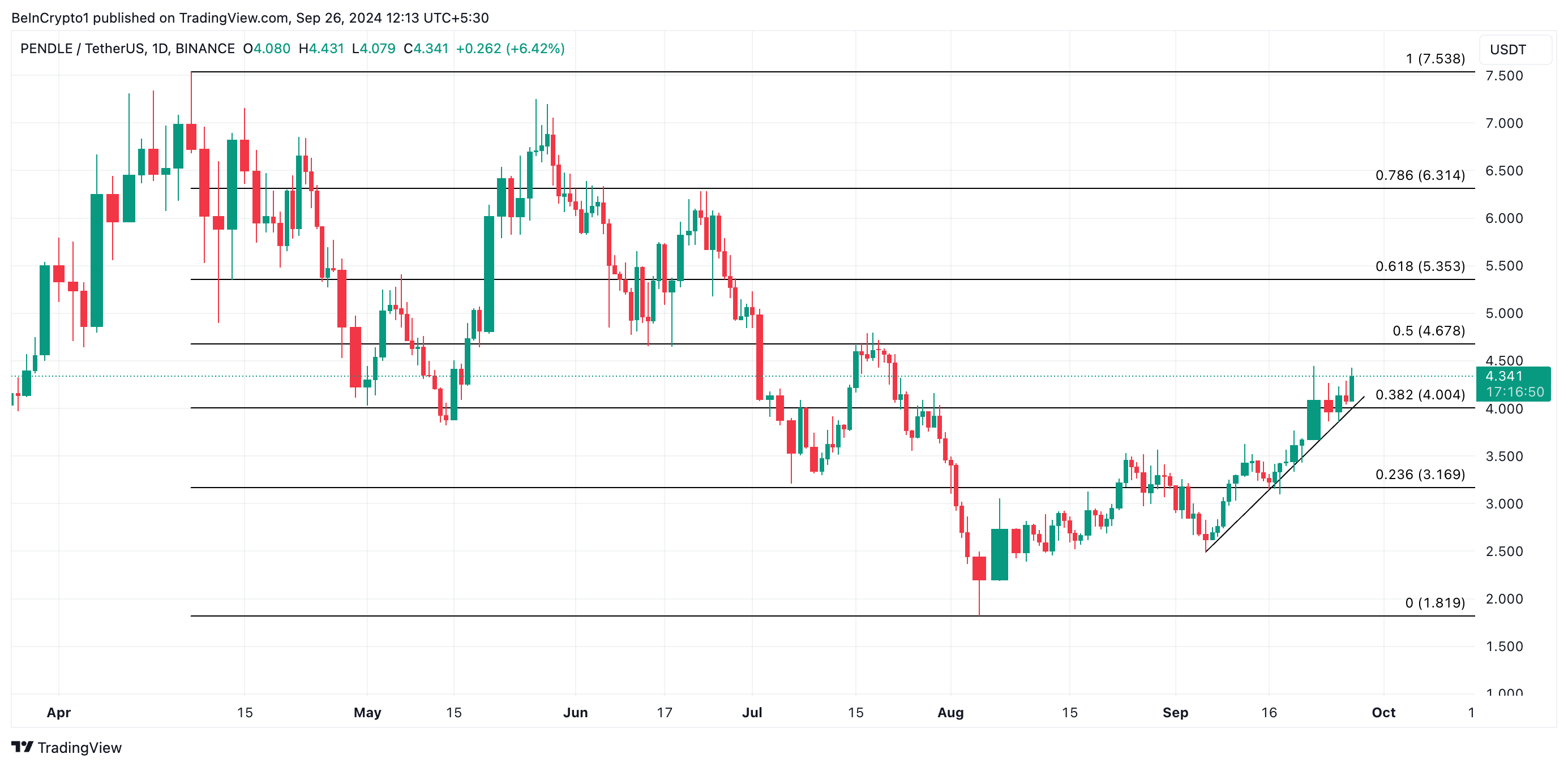 PENDLE, nytte-tokenet for Pendle-protokollen, har sett en kraftig økning i verdi, og har steget 27 % den siste uken, noe som gjør den til en av de viktigste RWA-altcoinsene å følge med på i oktober. For øyeblikket handles den til $ 4.34, og PENDLE har opprettholdt en sterk oppadgående bane, og handles over en stigende trendlinje de siste ukene.