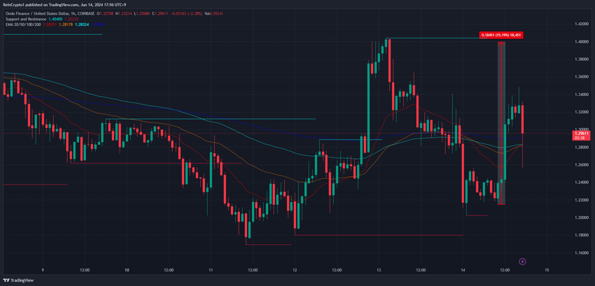 Etter Upbits kunngjøring steg ONDOs pris fra $ 1, 21 til $ 1, 39, og markerte en økning på 15 % på få timer. Imidlertid korrigerte prisen senere til $1,29, noe som indikerer en viss stabilisering.