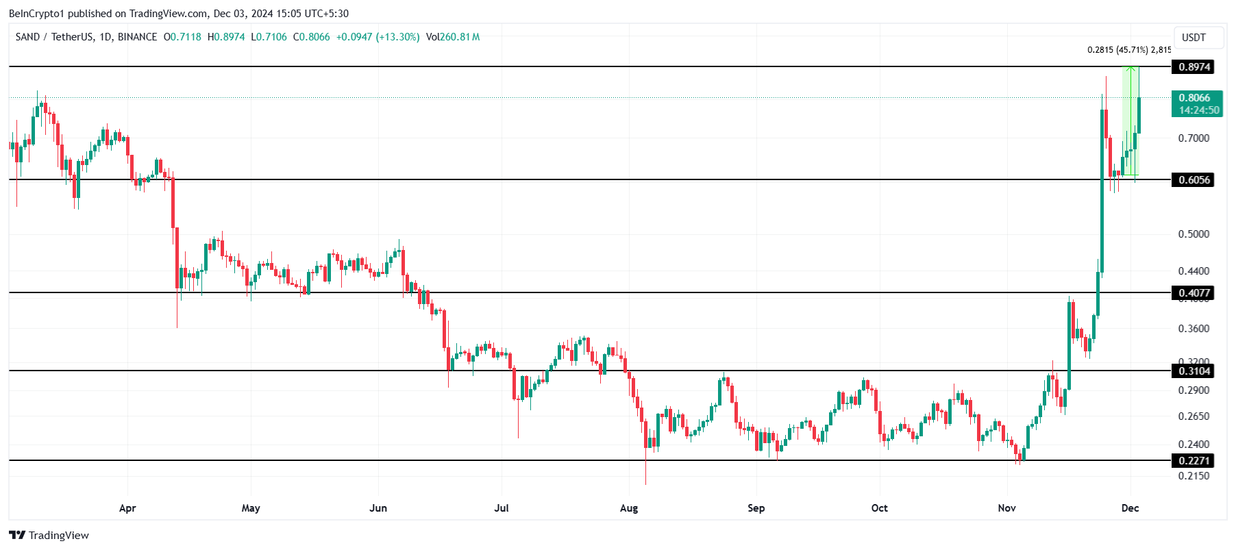 SAND nådde et 22-måneders høydepunkt på $ 0,89 i løpet av de siste 24 timene, og steg med omtrent 45 %. Denne økningen markerer en imponerende milepæl for altcoinen, men bærekraften til denne oppgangen avhenger av bredere markedsforhold. Hvis Metaverse-narrativet fortsetter å få fotfeste og positivt sentiment vedvarer, kan SAND opprettholde sin oppadgående trend.