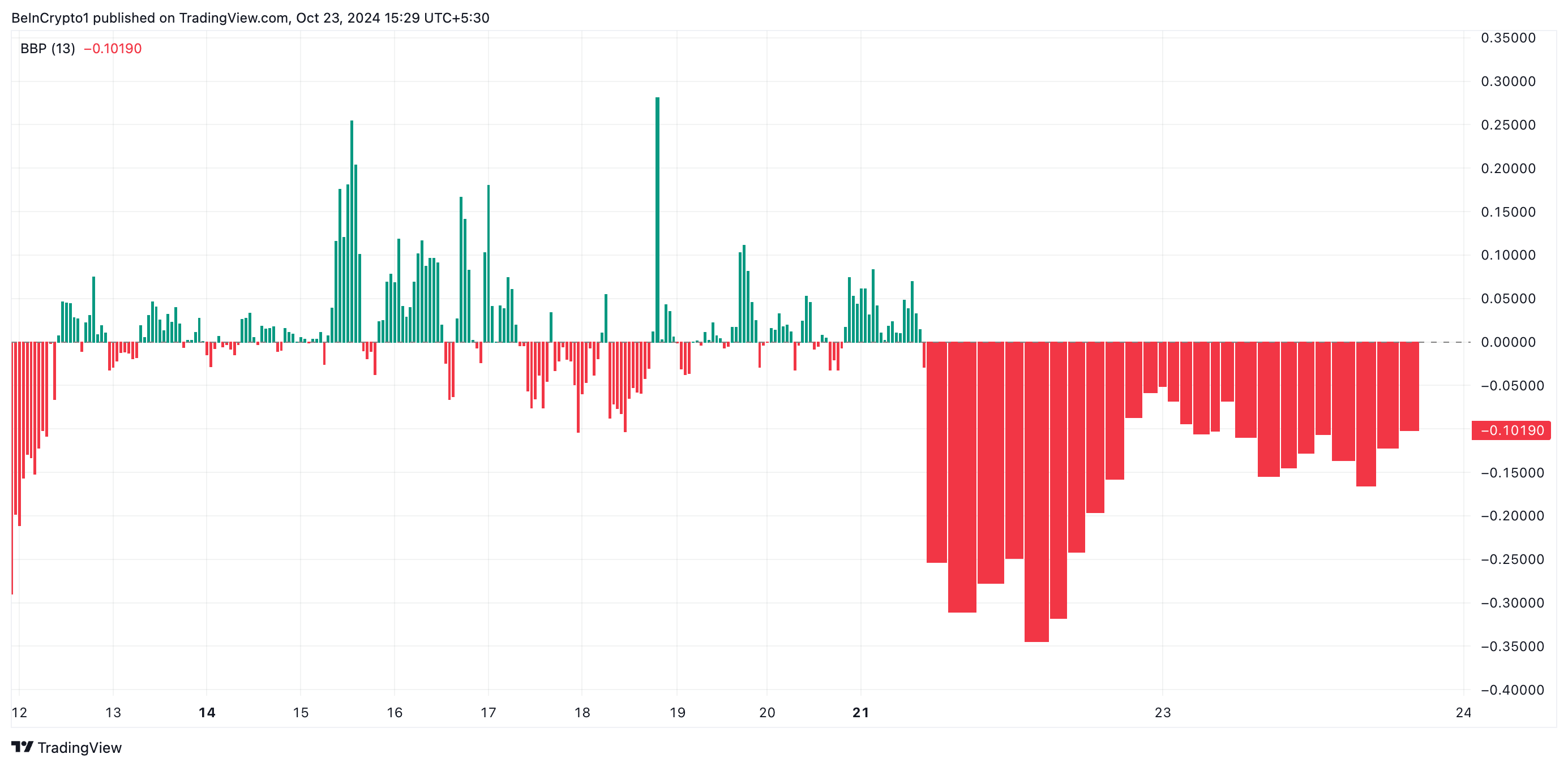 For det første fortsetter den bearish stemningen rundt altcoinen å vokse, som bevist av den negative verdien av dens Bull Bear Power (BBP), som står på -0,10 i skrivende stund.
