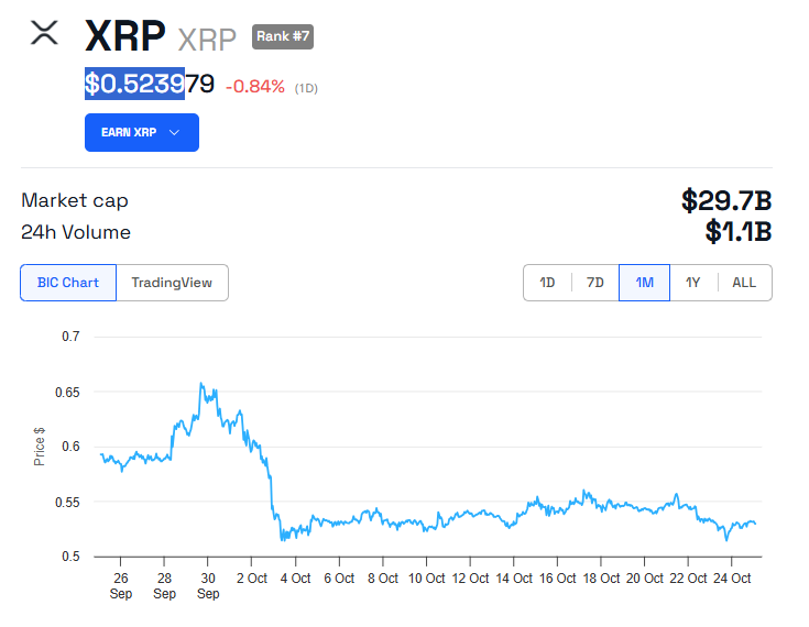 I skrivende stund viser data fra BeInCrypto at XRP kursen har falt 0,84 % de siste 24 timene, og handles for $ 0,5239.