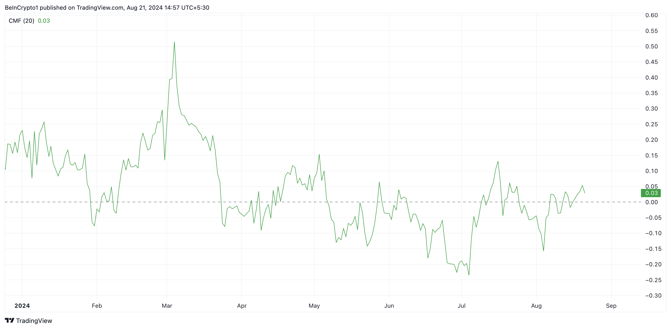 Denne indikatoren måler hvordan penger flyter inn og ut av en aktiva — en positiv CMF signaliserer markedsvekst ettersom den indikerer likviditetsinngang. På 0,03 antyder SHIBs CMF at kjøpspresset overgår salgsaktiviteten, noe som øker sannsynligheten for at prisen bryter over det fallende kilen.