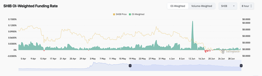 Til tross for den uforminskede nedgangen i SHIBs verdi og den lave aktiviteten i derivatmarkedet, er det en fortsatt etterspørsel etter lange posisjoner. Målinger fra finansieringsrenten viser at den har holdt seg overveiende positiv de siste månedene. SHIBs finansieringsrate på tvers av kryptovalutabørser er 0,0093% i skrivende stund.
