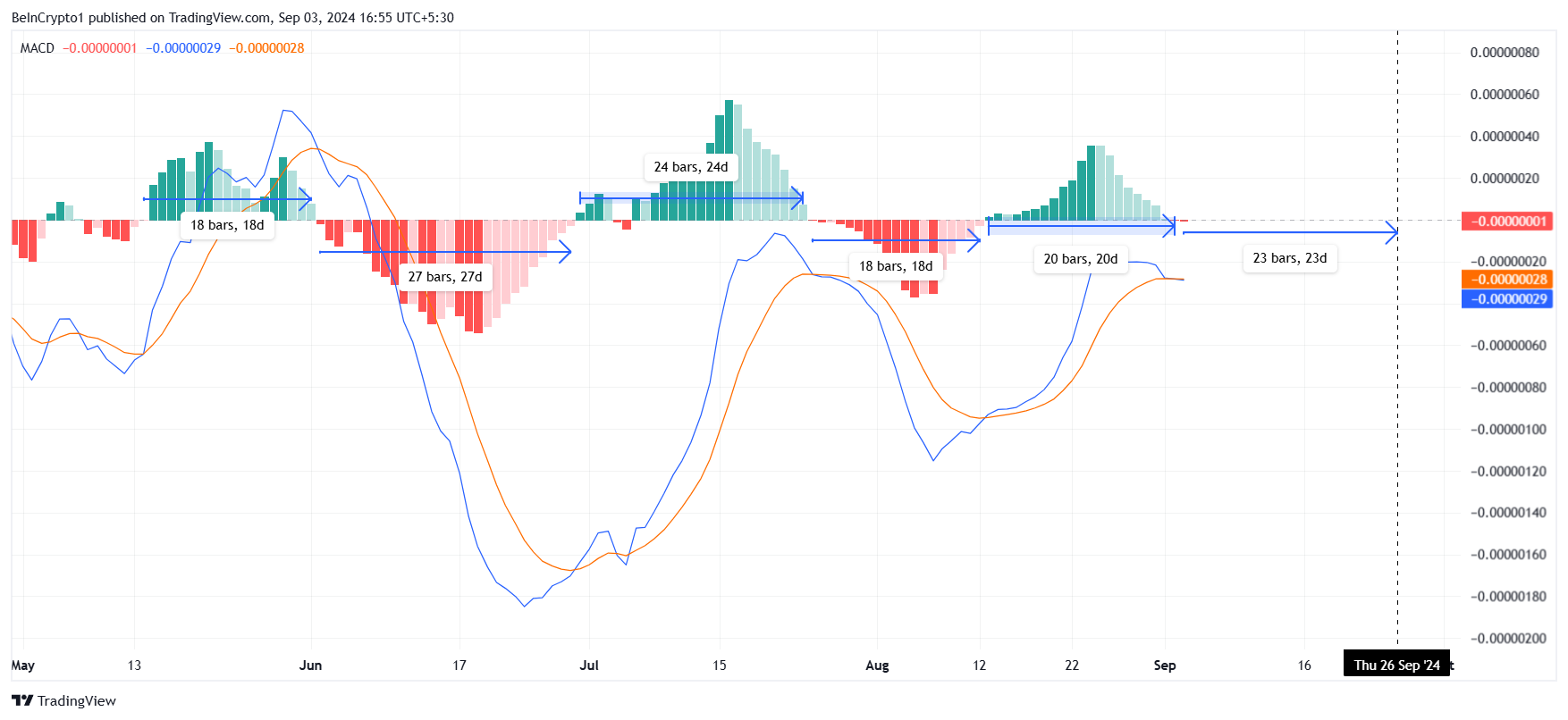I tillegg avslører en analyse av Shiba Inus makromomentum et bekymringsfullt mønster. Moving Average Convergence Divergence (MACD)-indikatoren har vist en tendens til å følge samme trend i perioder som varierer fra 18 til 27 dager. I SHIBs tilfelle bemerket MACD nylig et bearish kryss, noe som indikerer at den nåværende nedadgående trenden kan vedvare i gjennomsnitt 23 dager.