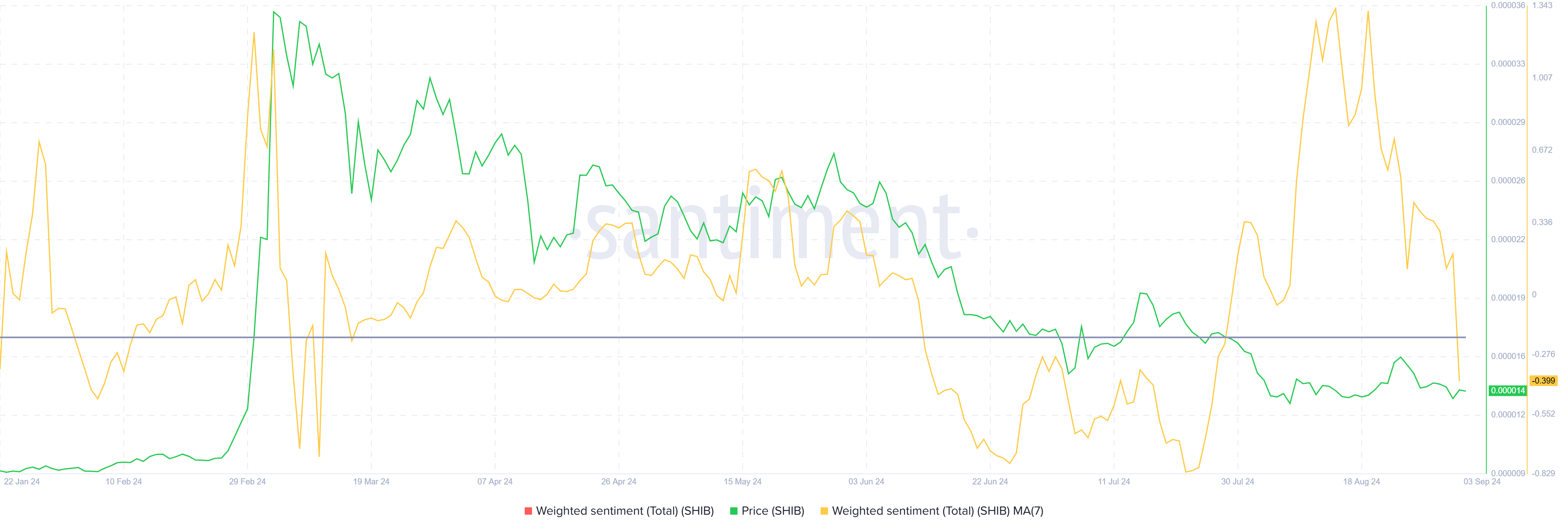 Nedgangen i sentimentet reflekterer økende pessimisme blant investorer ettersom de sliter med mangelen på oppadgående momentum i SHIBs pris. Rådende negativt sentiment indikerer at mange investorer også mister tilliten til en nærstående oppgang. Dette kan ytterligere dempe enhver potensiell bullish utbrudd.