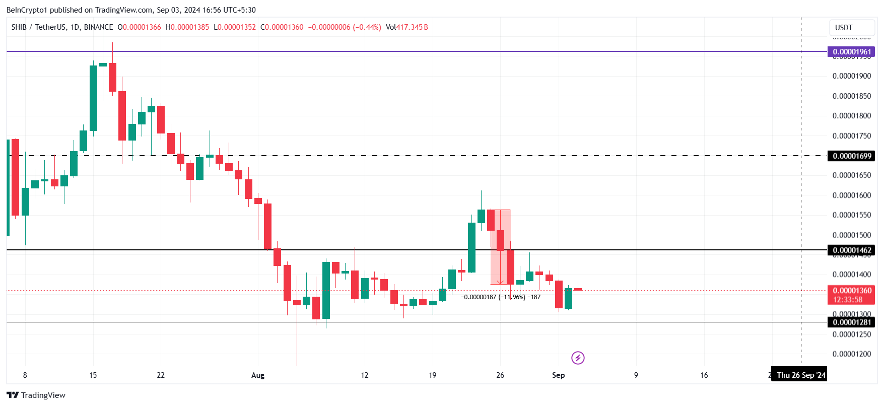Shiba Inu kurs hadde en kort mulighet til å unnslippe sin konsolideringsrekkevidde, som strekker seg mellom $0.00001462 og $0.00001281. Imidlertid forhindret et fall på 12 % sent i august dette forsøket, noe som førte til at SHIB forble fanget innenfor dette smale området.