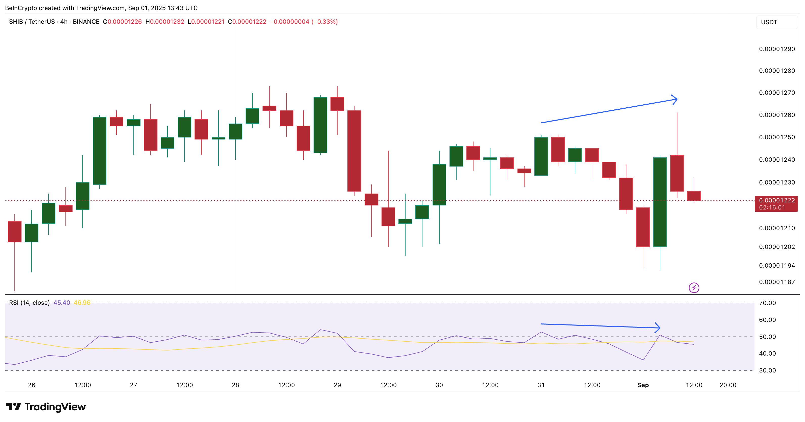 Men 4-timers diagrammet viser nå en bearish divergens, der Shiba Inu kursen nådde en høyere topp mens RSI registrerte en lavere topp. Siden RSI sporer momentum ved å sammenligne kjøps- og salgspress, antyder dette at mens kjøpere presset prisen høyere, avtok deres styrke ettersom gevinsttakere kom inn.