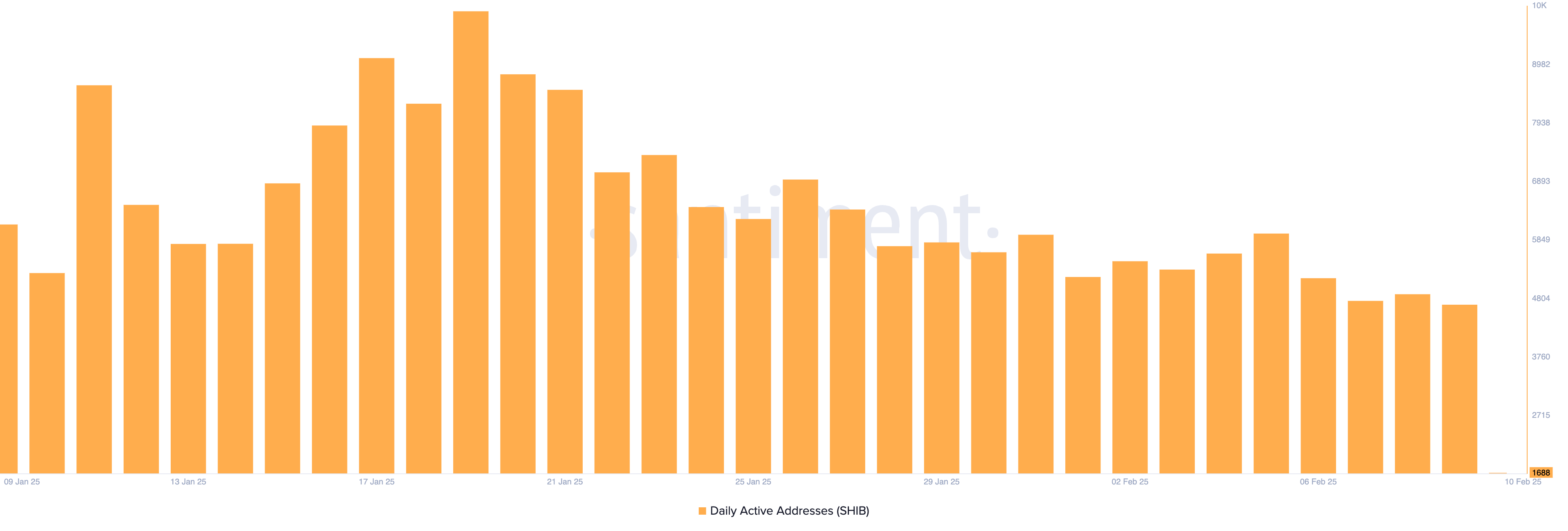 For kontekst, den 9. februar, engasjerte 4690 aktive lommebokadresser seg i minst én SHIB-transaksjon. Dette markerte en nedgang på 53 % fra årets høyeste antall på 9928 aktive adresser registrert 19. januar.