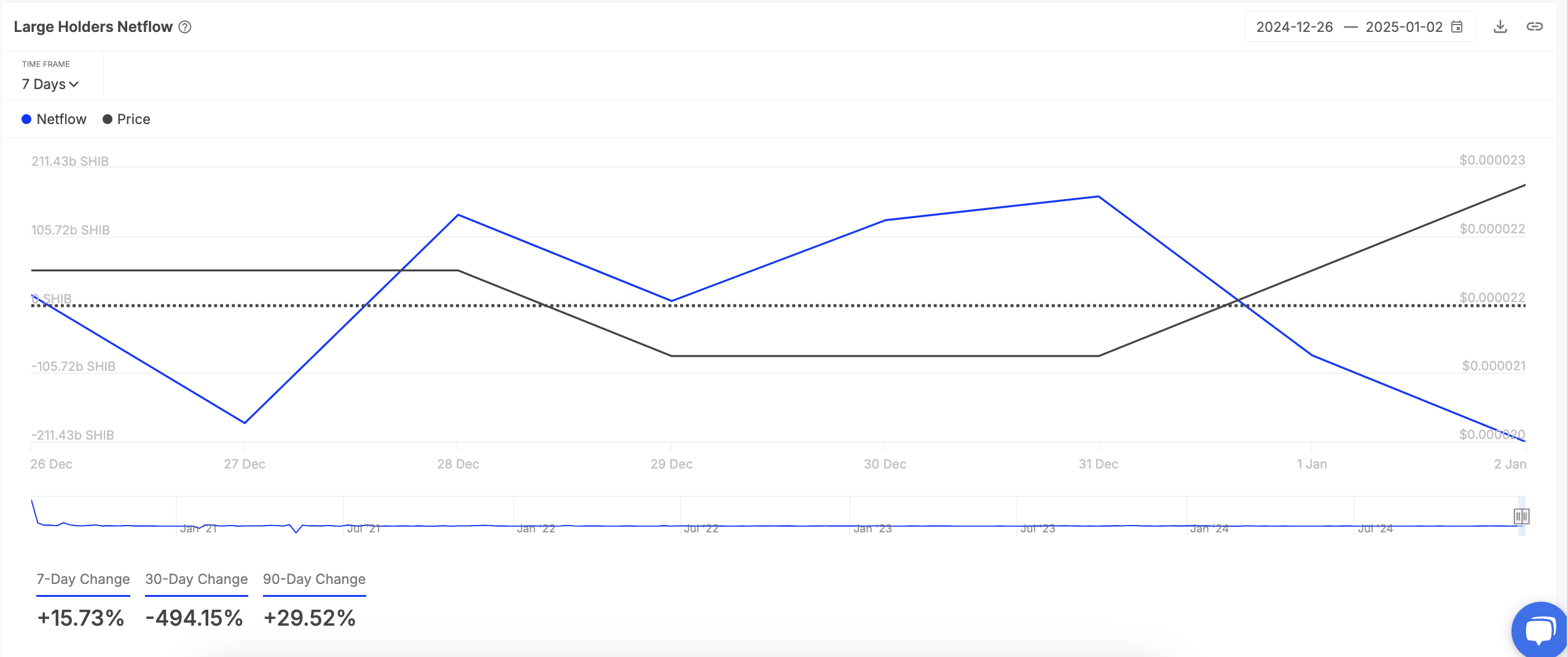 Ifølge IntoTheBlock har SHIB notert en 16 % økning i sine store innehaveres nettoflyt den siste uken. Dette er hval-lommebøker som holder mer enn 0,1 % av meme coinens sirkulerende forsyning. Deres nettoflyt sporer forskjellen mellom myntene de kjøper og mengden de selger over en spesifikk periode.