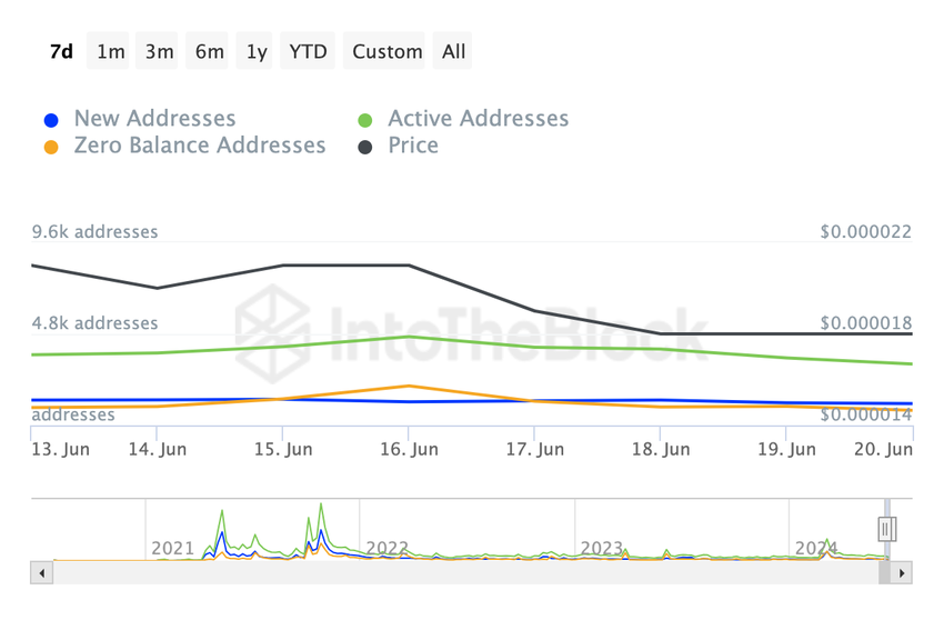 Bortsett fra markedsverdien, har aktiviteten på Shiba Inus nettverk vært lite imponerende, som vist av de aktive, nyhets- og nullbalanseadressene