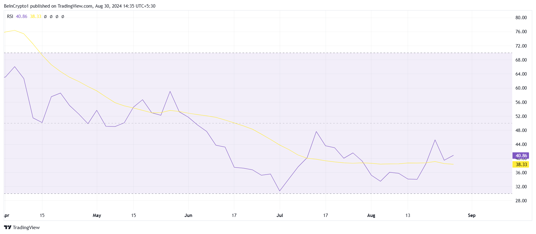 Uansett det nylige salgspresset, forblir Shiba Inu kursens overordnede makromomentum dypt bearish. Dette bearish sentimentet bekreftes av Relative Strength Index (RSI), som har holdt seg under det nøytrale merket siden tidlig juni, noe som signaliserer vedvarende svakhet i markedet.
