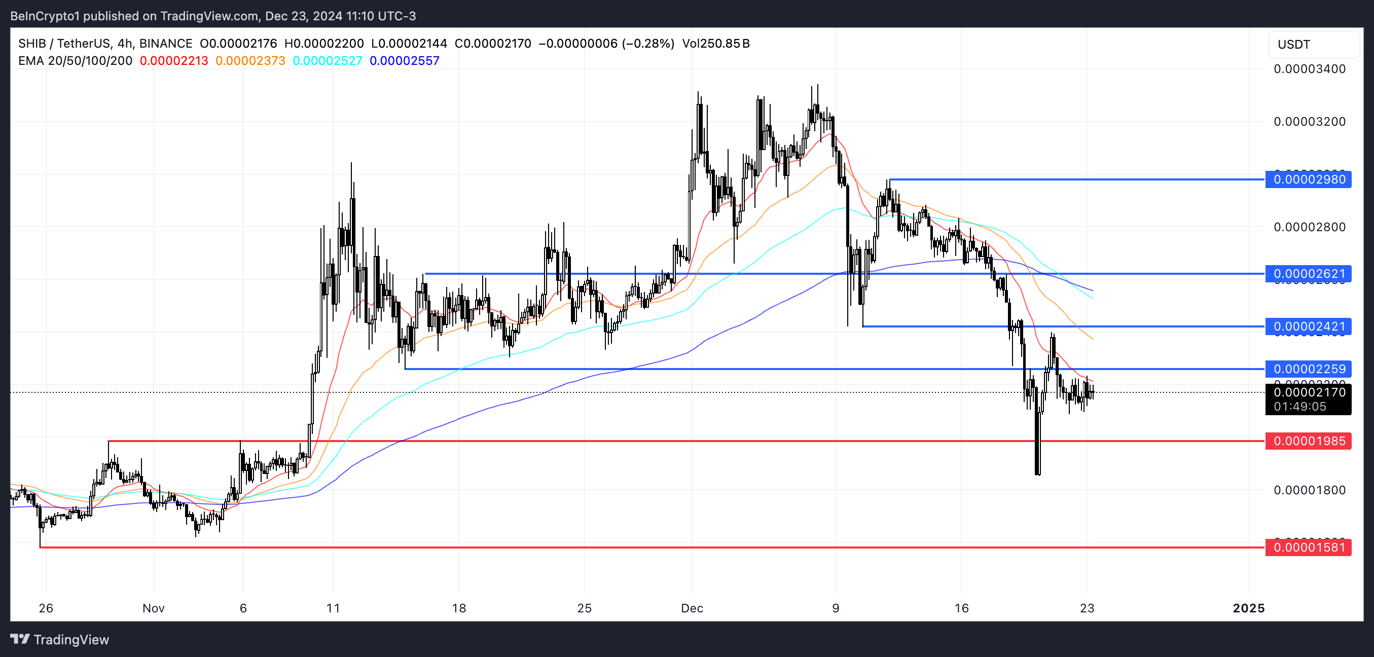 Hvis SHIB kurs ikke klarer å opprettholde den kritiske støtten på $0,00001985, kan prisen oppleve en dypere korreksjon, potensielt teste det lavere støttenivået på $0,0000158.