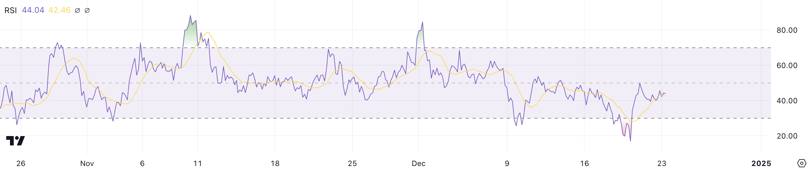 Denne svingningen representerer en betydelig endring i markedsmomentum, ettersom RSI måler hastigheten og størrelsen på nylige prisendringer på en skala fra 0 til 100. Når RSI faller under 30, anses aktiva som oversolgt, mens avlesninger over 70 signaliserer overkjøpte forhold.