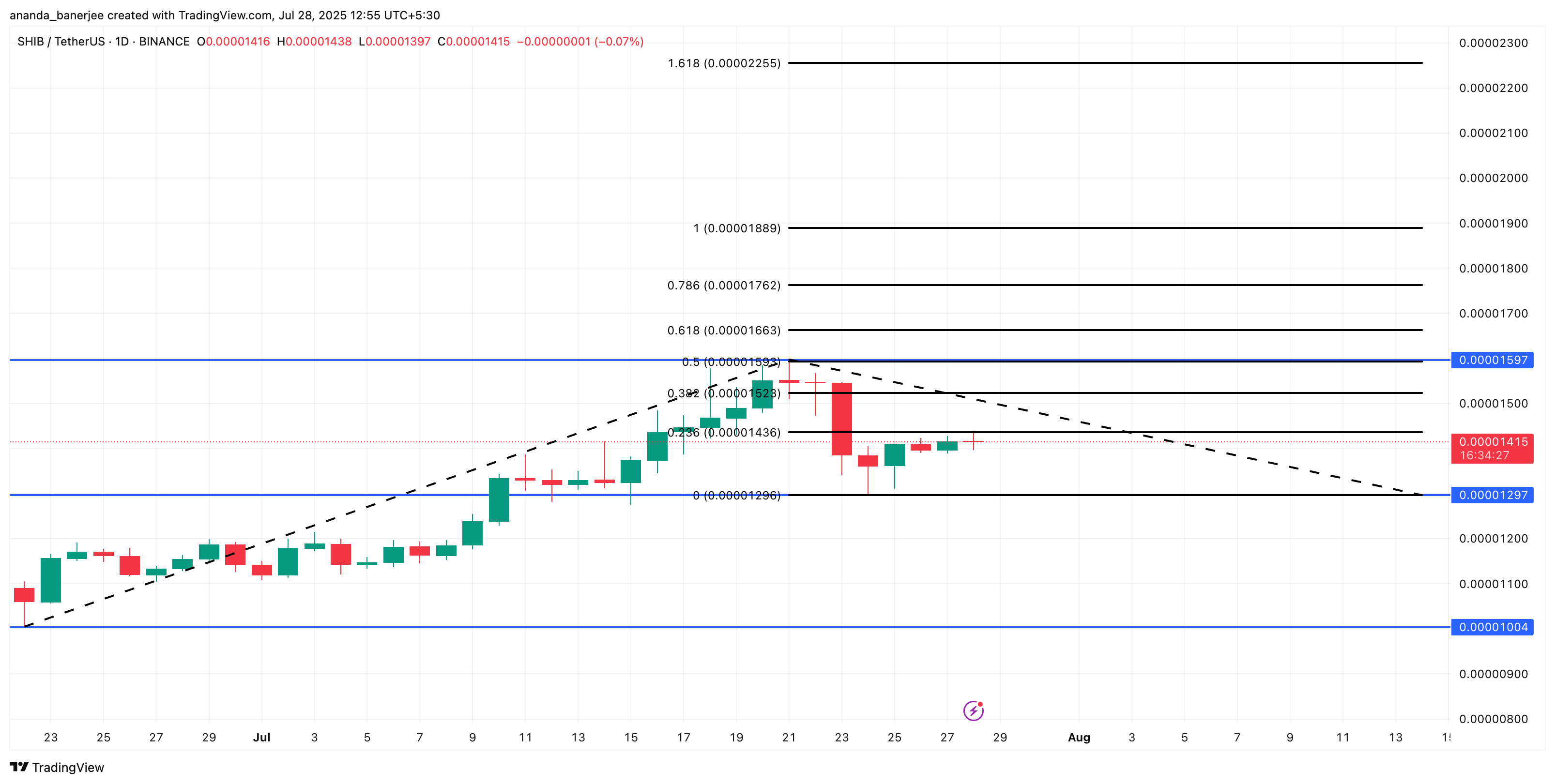 Shiba Inu (SHIB) kursen forblir ubestemt, låst i et smalt område nær $0,000014 med daglige bevegelser begrenset til under 1 %. Mens okser og bjørner fortsetter å kjempe om kortsiktig kontroll, holder SHIB fortsatt på en månedlig gevinst på 24 %, noe som antyder at momentumet ikke helt har forsvunnet.
