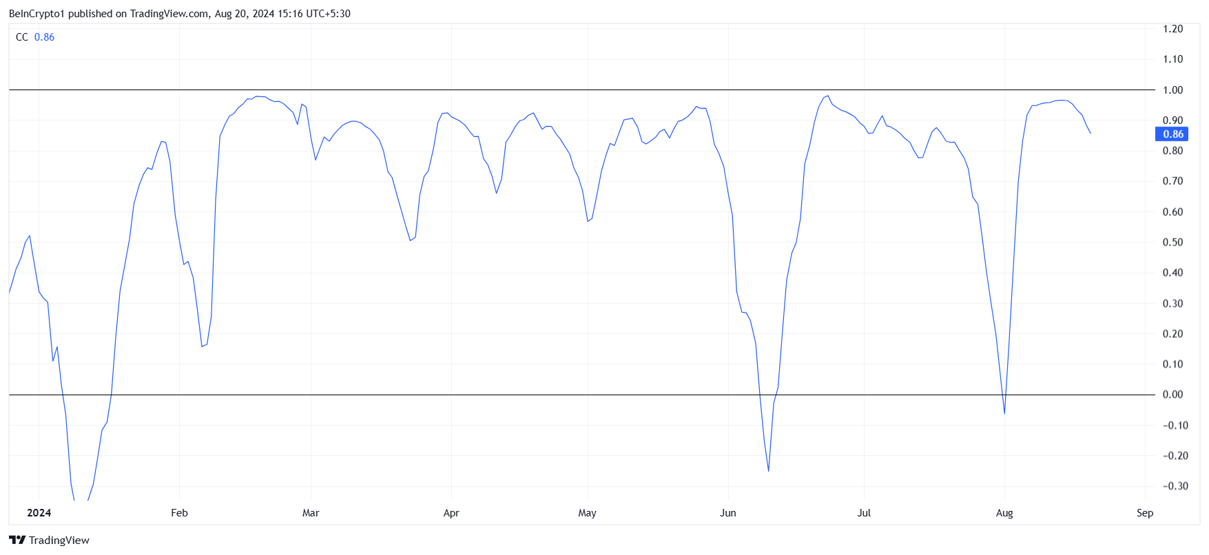 Imidlertid er Bitcoins innflytelse på meme coin ganske sterk i øyeblikket. Korrelasjonen som SHIB deler med BTC er for øyeblikket på 0,86 etter å ha kommet seg fra negativ i begynnelsen av august.