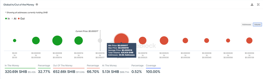 Dette er et sannsynlig utfall siden milliarder av dollar i fortjeneste for tiden står på spill for SHIB-investorer. I følge Global In/Out of the Money (GIOM)-indikatoren venter rundt 425 billioner SHIB til en verdi av mer enn 7,3 milliarder dollar på en utløser.