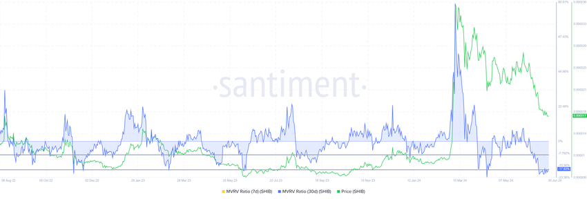 MVRV-forholdet vurderer investorens fortjeneste og tap. For øyeblikket står Shiba Inus 30-dagers MVRV på -17%, noe som indikerer tap som kan føre til kjøpepress. Historisk sett signaliserer SHIB MVRV mellom -8% og -18% vanligvis starten på gjenoppretting og samlinger, og markerer en mulighetssone for akkumulering.