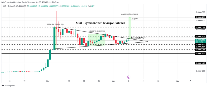 Shiba Inus kurs på 0,00002852 dollar er nær ved å bryte ut av det symmetriske trekantmønsteret. Et slikt mønster dannes når to konvergerende trendlinjer møtes, noe som indikerer en periode med ubesluttsomhet i markedet.