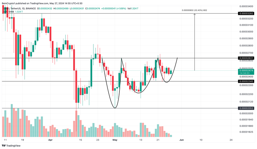 Hvis SHIB lykkes med å bryte halslinjen på 0,00002631 dollar, kan den potensielt oppleve en økning på omtrent 32 % fra den nåværende markedsprisen mot motstanden på 0,00003282 dollar.