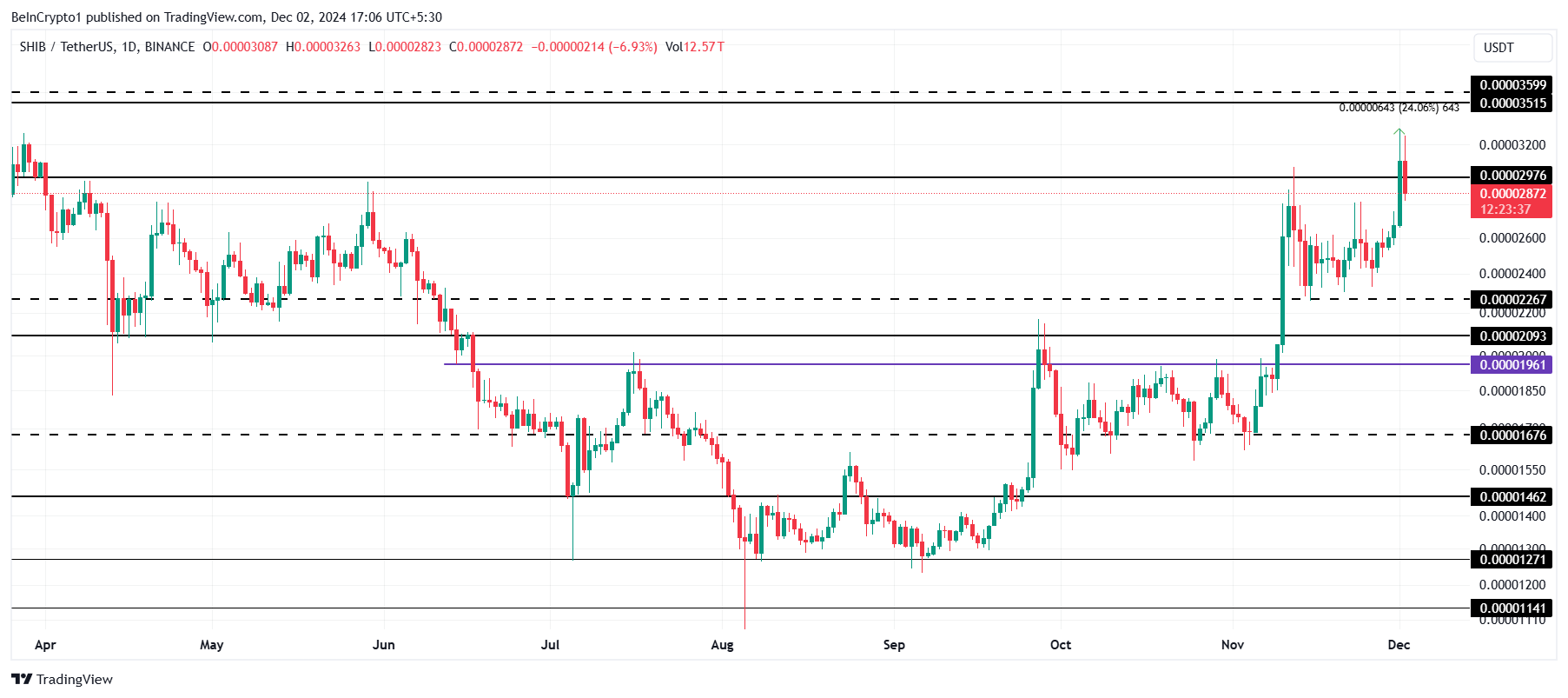 Shiba Inu gikk glipp av en avgjørende mulighet til å stenge over motstandsnivået på $0,00002976. På grunn av dette risikerer coinen å falle mot støttenivået på $0,00002267.