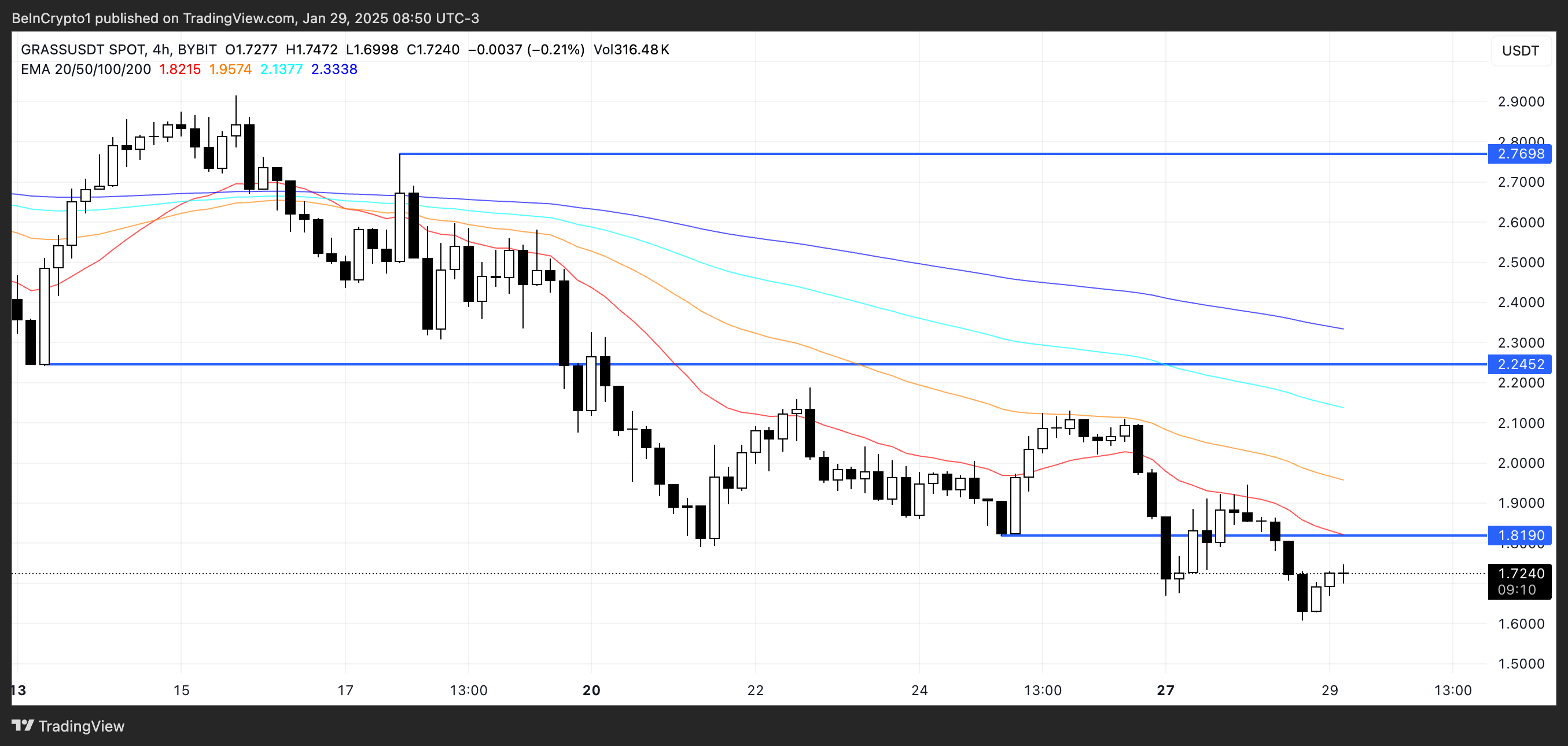 Hvis AI-relaterte altcoins gjenvinner momentum i februar, kan GRASS kurs dra nytte av den fornyede interessen. En oppgang mot $ 2-området er mulig, og hvis opptrenden styrker seg, kan tokenet også gjenbesøke $ 3-nivået.
