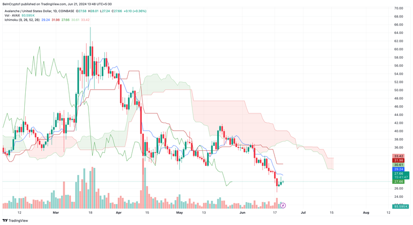 Ichimoku Cloud-indikatoren viser imidlertid at AVAX kan oppleve en snublestein i forsøket. Hvis dette skjer, vil den bullish prisforutsigelsen bli ugyldiggjort.