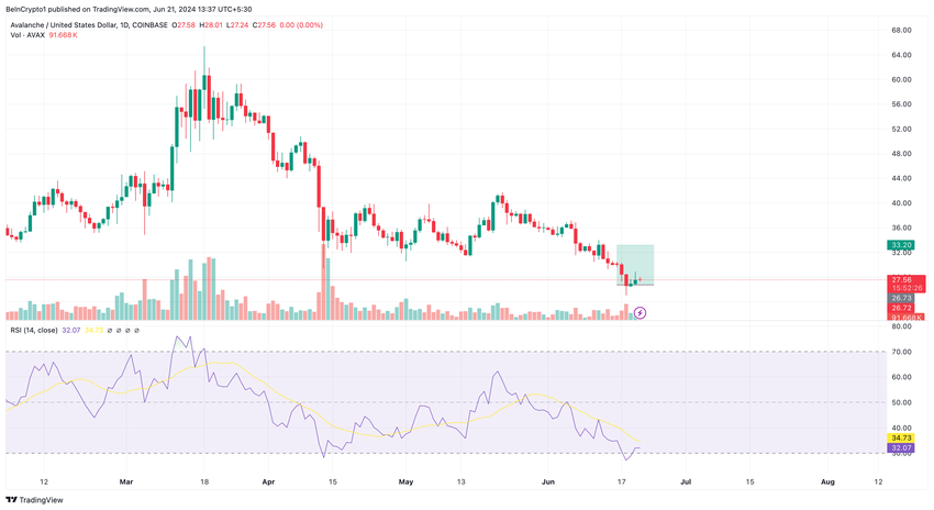 18. juni falt AVAX til den oversolgte regionen. Men klokken 32.07 avslører RSI at det begynner å dukke opp små dråper med kjøpepress. Hvis okser opprettholder dette momentumet, kan AVAXs pris hoppe til $30,95. I et svært bullish scenario kan tokenets verdi nå $33,20.