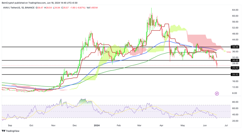Midt i Bitcoins nedgang fra $ 70 000 til $ 64 000, har AVAX falt med 28% fra 7. juni, og nådde et sentralt støttenivå på $ 25.