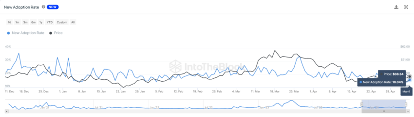 Denne usikkerheten om AVAX-prisens utfall gjenspeiles også blant de nye investorene som blir med i nettverket. For øyeblikket er adopsjonsraten for Avalanche på 16%. Dette betyr at av 100 nye AVAX-innehavere er det bare 16 som gjennomfører transaksjoner i nettverket.
