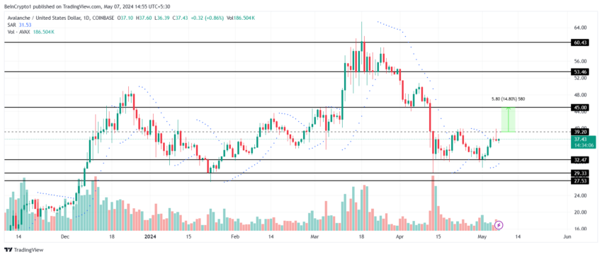 Avalanche-kursen, som i skrivende stund handles til 37 dollar, sliter med å holde seg over 40 dollar. Dette har skjedd flere ganger tidligere, og å snu det til støtte fører vanligvis til at AVAX når den avgjørende psykologiske støtten på $ 45.
