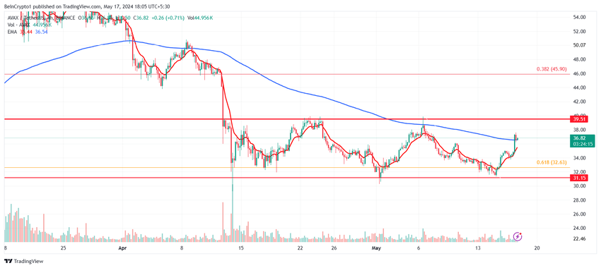 Avalanches pris, $ 36, har steget 15% de siste tre dagene, og trukket den opp fra $ 31. Sistnevnte markerte den nedre grensen for konsolideringsområdet AVAX har sittet fast i i en måned. Den øvre grensen ligger på $ 39.
