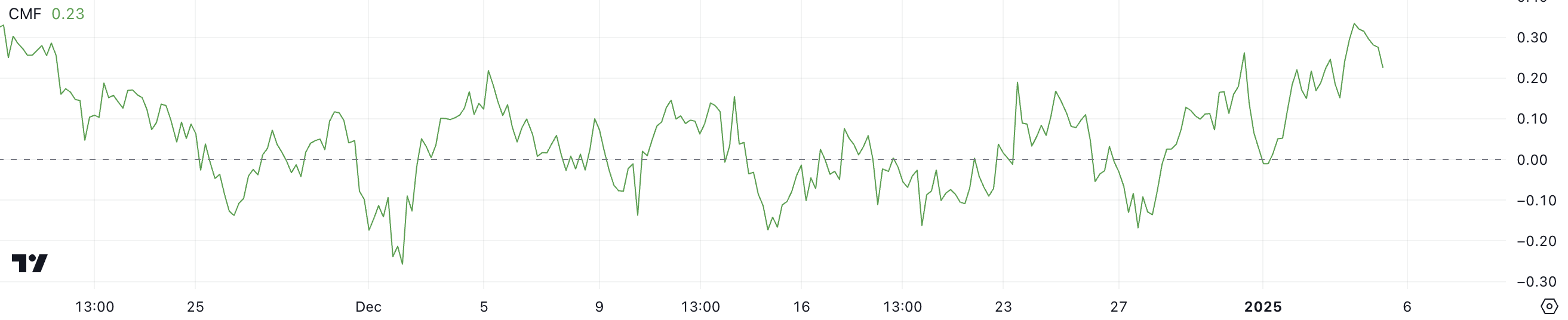 På 0,23 forblir SOL CMF i positivt territorium, noe som indikerer vedvarende kjøpsinteresse, om enn med litt redusert intensitet sammenlignet med den nylige toppen. Denne nedgangen fra 0,33 kan antyde at kjøpspresset har avkjølt seg litt, noe som potensielt antyder en periode med konsolidering eller langsommere oppadgående momentum for prisen.