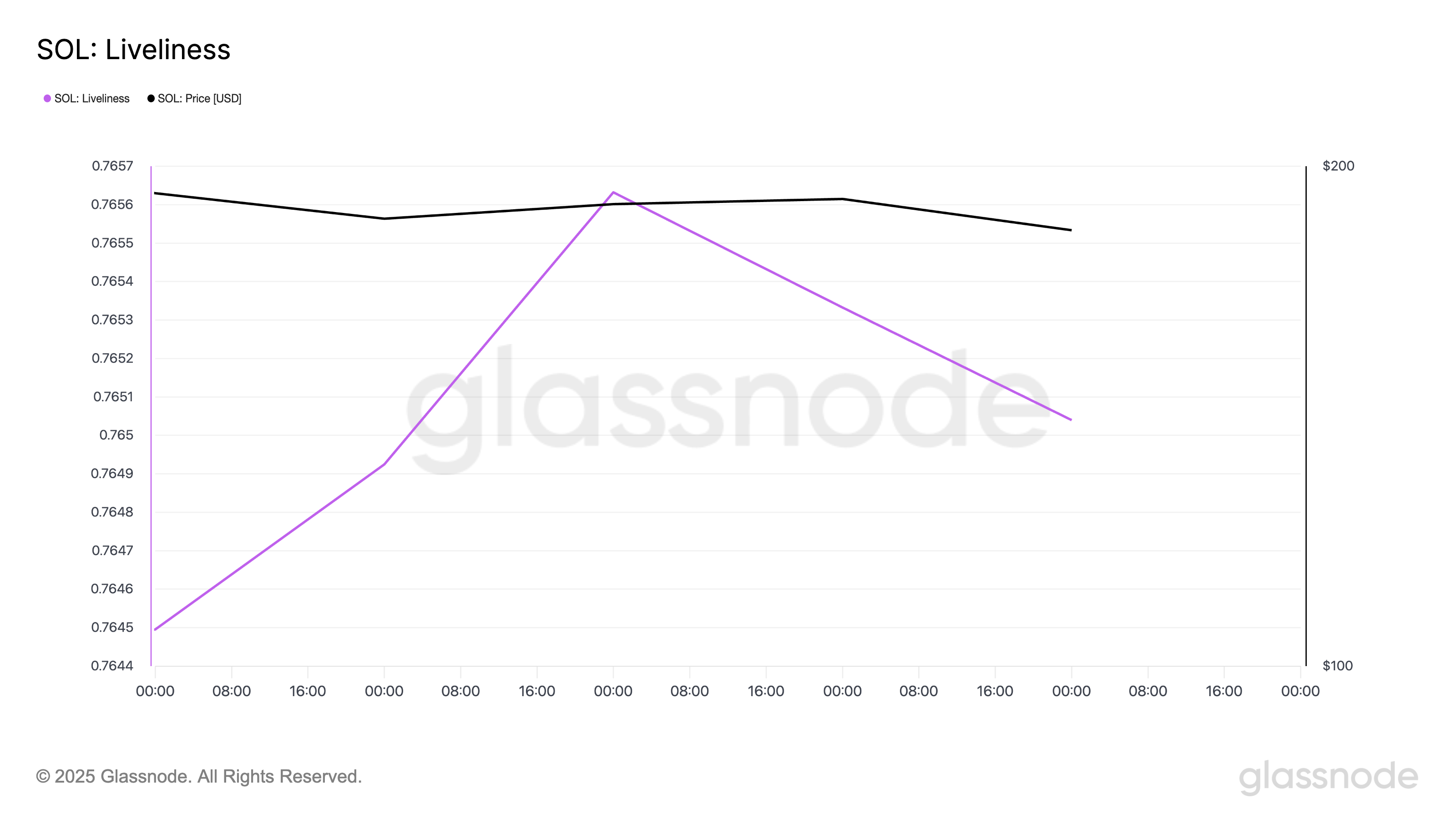 Glassnodes data har vist en jevn nedgang i SOLs Liveliness siden 16. august. Den begynte å falle etter en topp på 0,7656, noe som bekrefter de avtagende salgene blant investorer som har holdt SOL i mer enn 155 dager.