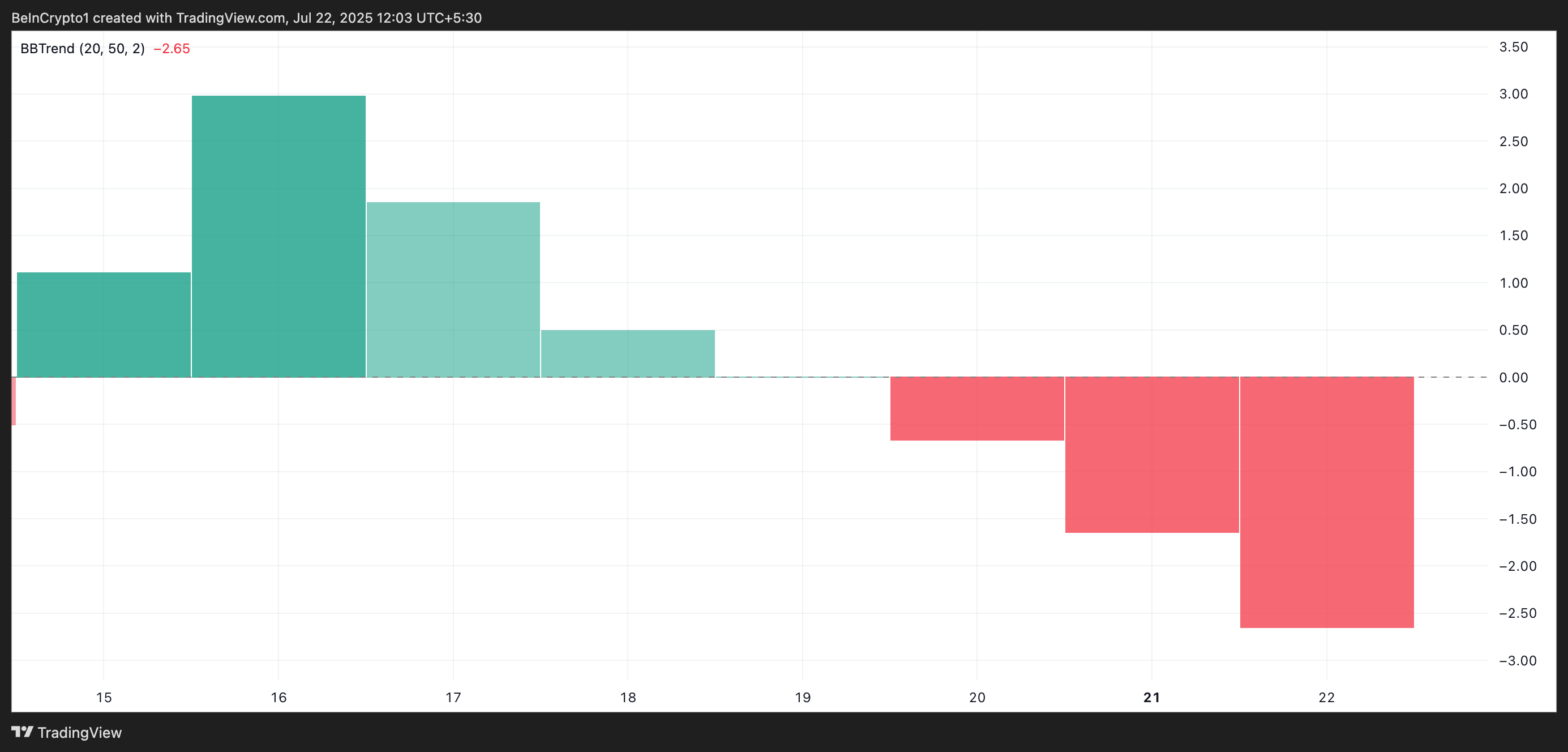 BBTrend måler styrken og retningen til en trend basert på utvidelsen og sammentrekningen av Bollinger Bands. Når den viser røde stolper, lukkes aktivaprisen konsekvent nær den nedre Bollinger Band, noe som reflekterer vedvarende salgspress og antyder potensialet for ytterligere nedside.