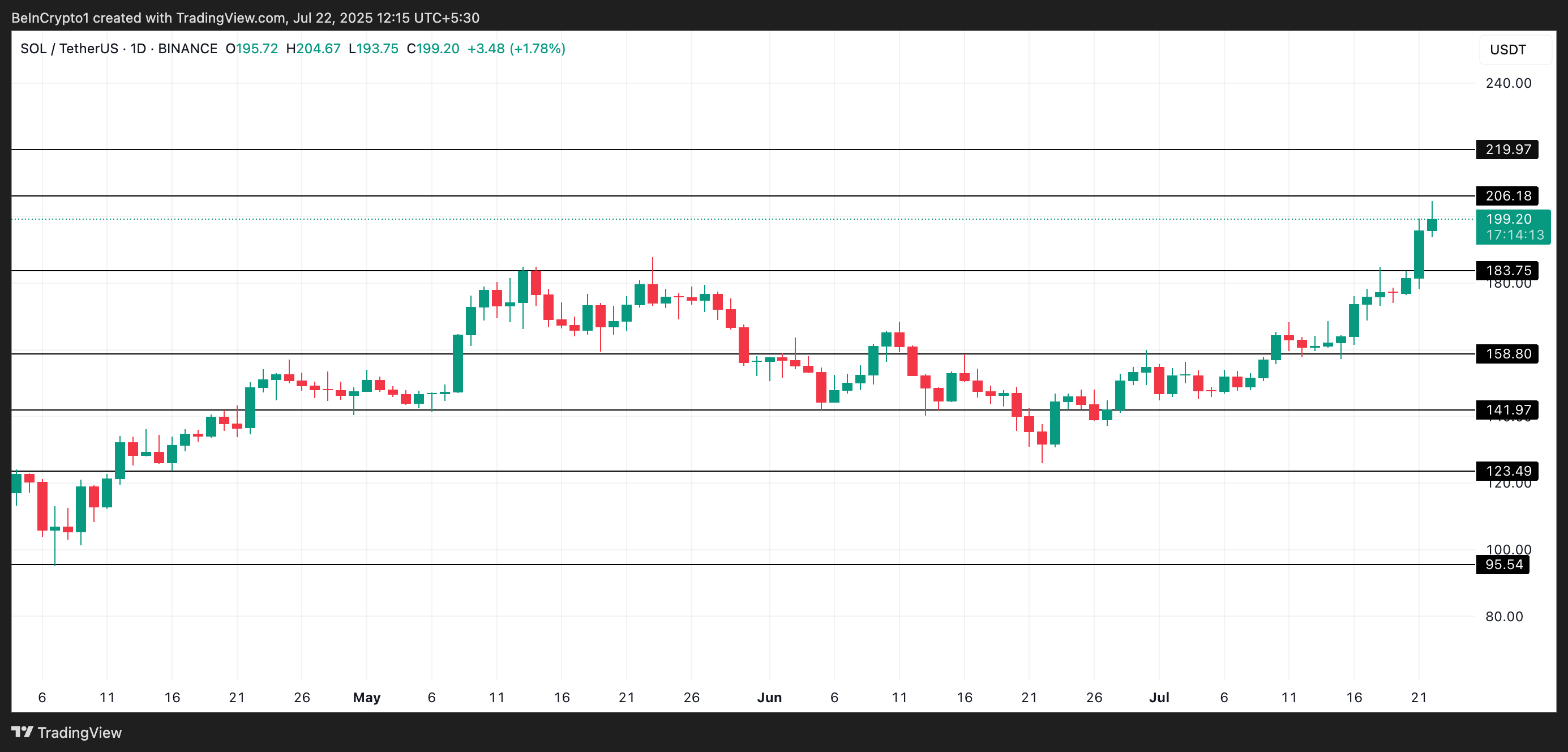 SOL har oppnådd tosifrede gevinster den siste uken og handles nå til $ 198,43, nærmer seg det psykologisk viktige $ 206 nivået, en pris den sist hadde i februar.