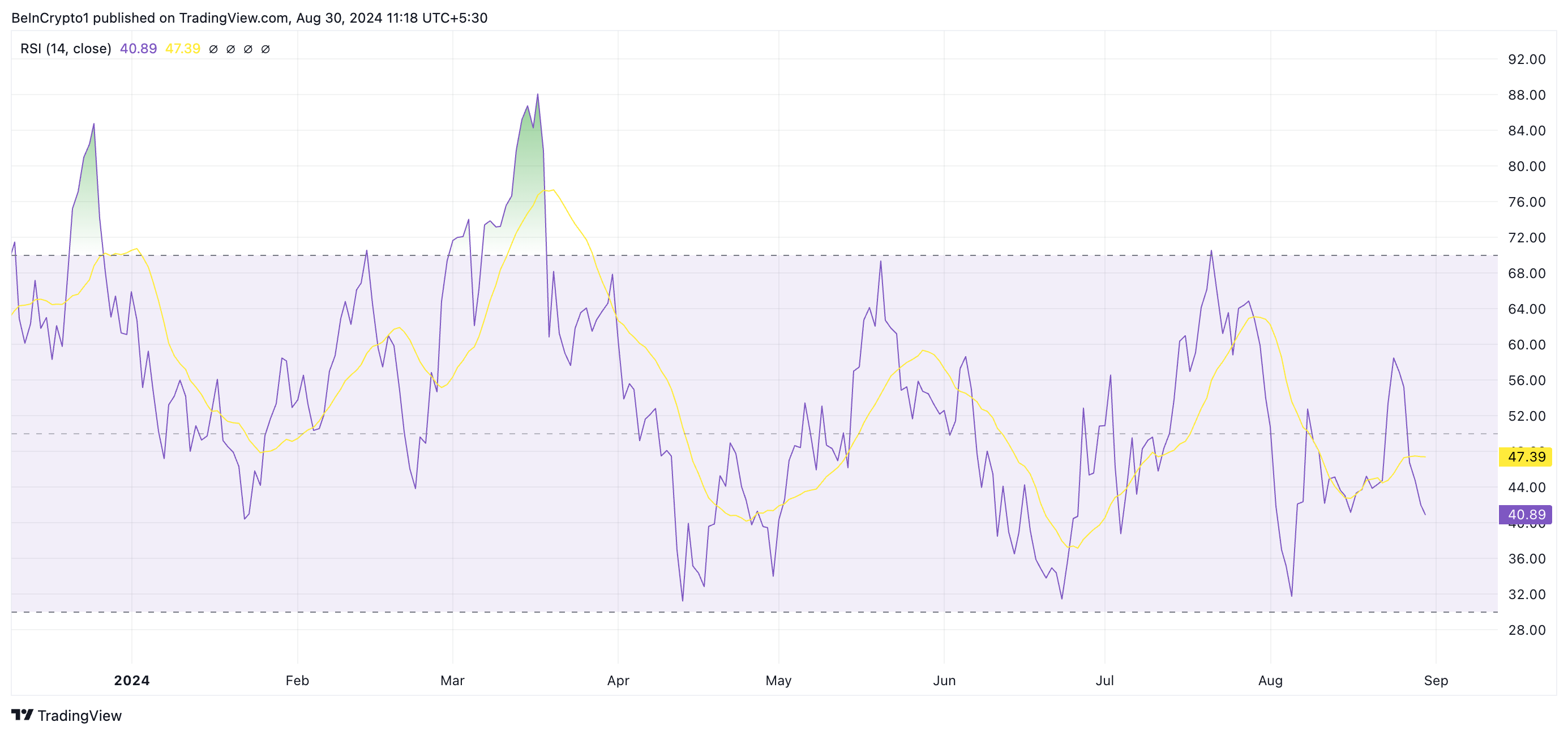 Nedgangen i SOLs Relative Strength Index (RSI), som er på 40,89 og trender nedover, bekrefter ytterligere det lave kjøpspresset. Dette tyder på at markedsdeltakerne er mer tilbøyelige til å selge enn å akkumulere SOL, noe som bidrar til den pågående nedadgående trenden.