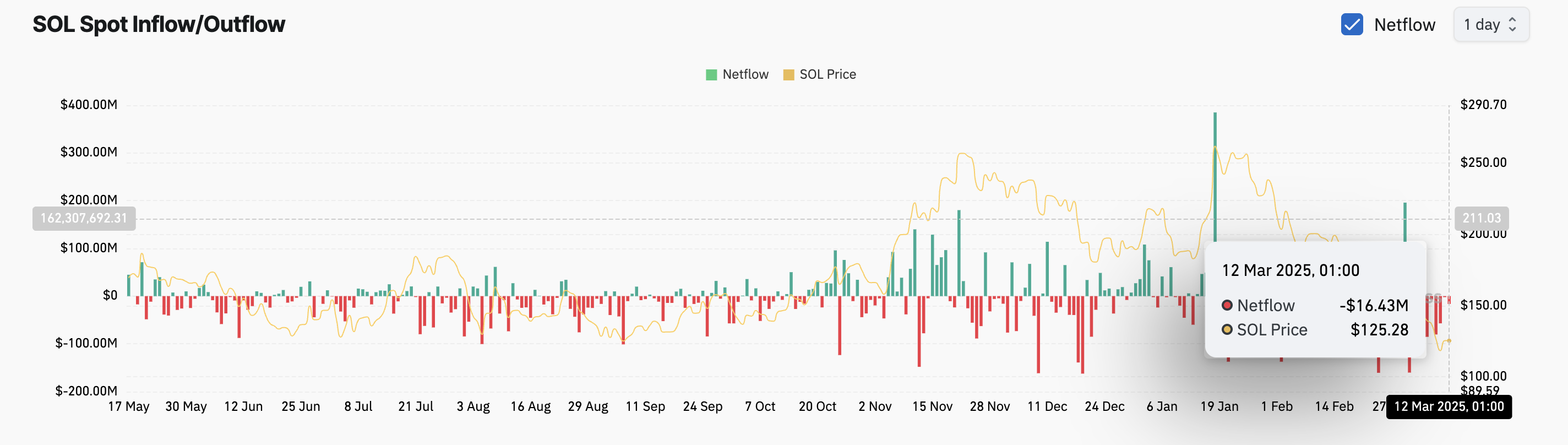 Dette har forverret den bearish stemningen mot SOL, noe som gjenspeiles i kapitalutstrømningene fra spotmarkedene de siste 24 timene. I skrivende stund har $ 16,43 millioner blitt fjernet fra markedet, og markerer den syvende dagen med sammenhengende utstrømninger, som nå har oversteget $ 250 millioner.