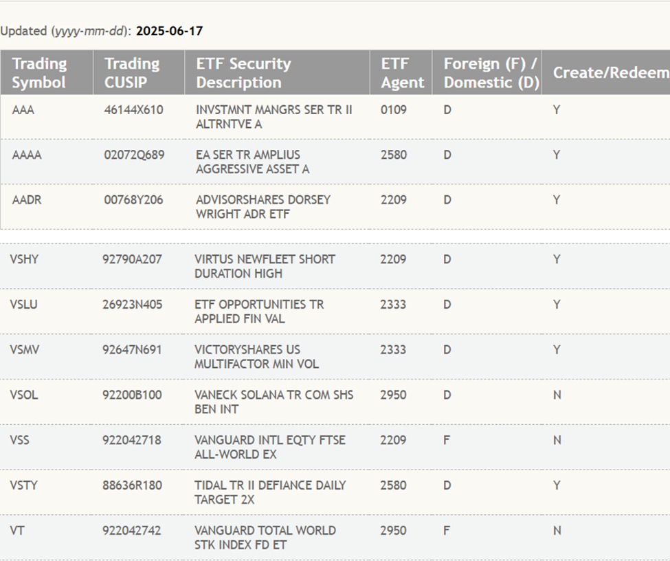 DTCC-noteringen, under kategorien “aktiv og før lansering”, bekrefter at fondet er kvalifisert for fremtidig elektronisk handel og clearing, avhengig av godkjenning fra US SEC (Securities and Exchange Commission).