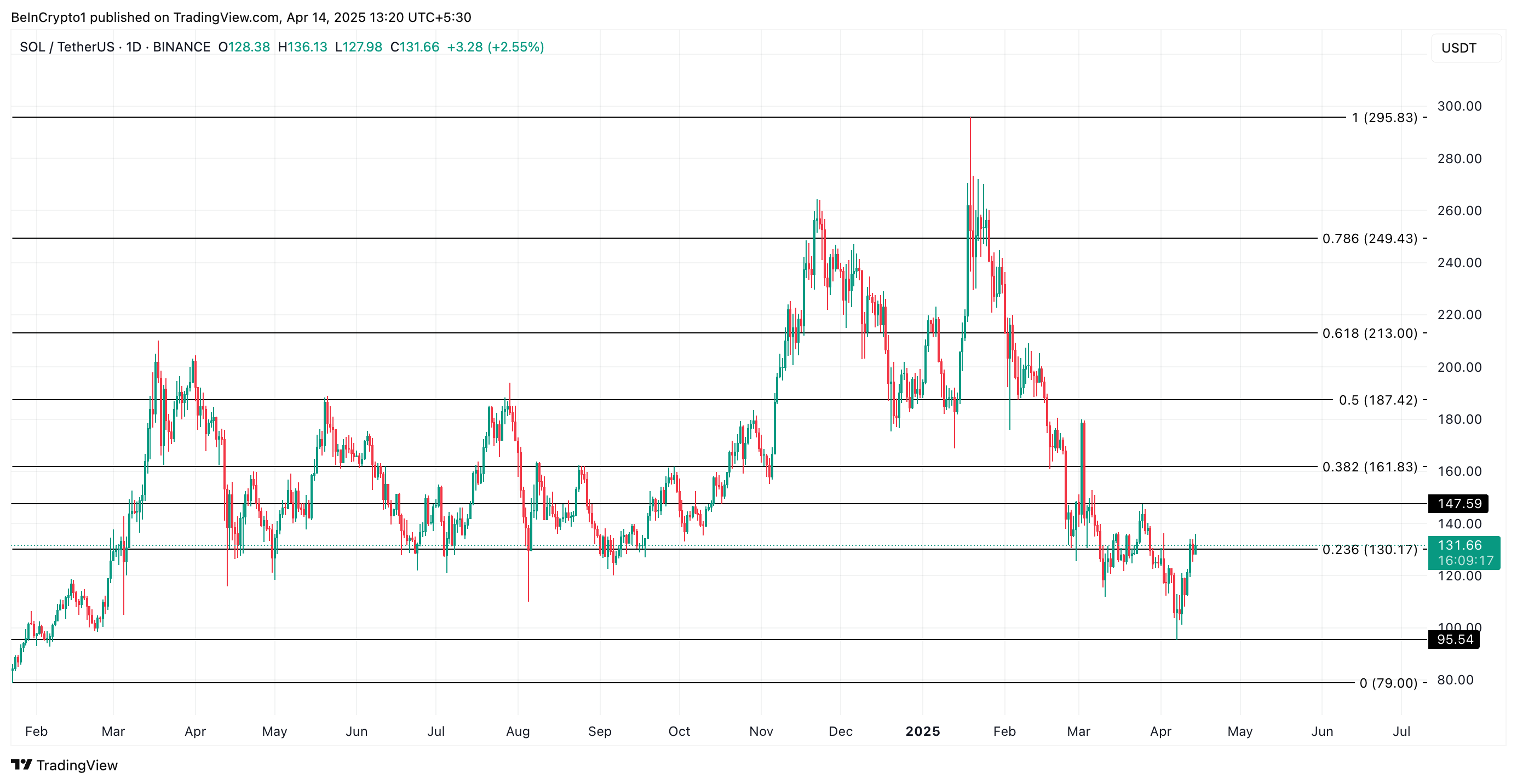 SOL handles for øyeblikket til $ 131,66, og forsøker å stabilisere seg over sitt nye støttenivå dannet på $ 130,17. Hvis etterspørselen etter longs vedvarer og bullish momentum forblir sterkt, kan SOL bryte ut av sine sideveis bevegelser og stige mot $ 147,59.